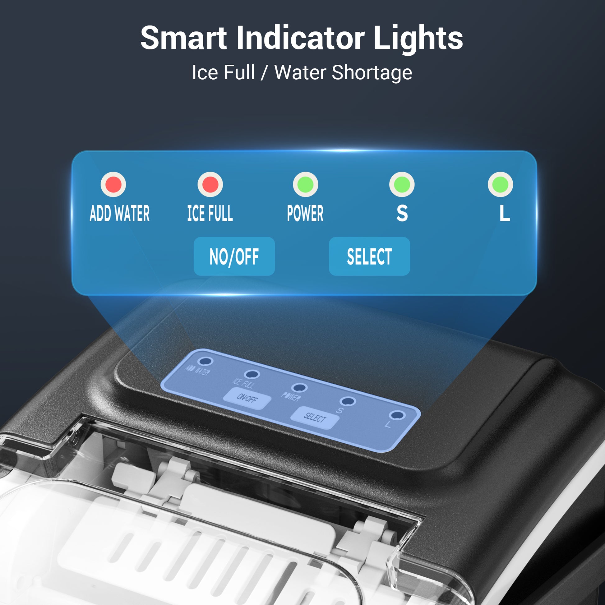- Smart Operation & Self-Cleaning- The ice maker has advanced infrared sensor. The "ICE FULL" indicator flashes remind you to take out ice to prevent overflowing when the basket is full. And it'll remind you to add water by flashing "ADD WATER". Additionly, the compact ice maker has a one-touch auto-cleaning function. Press the “ON/OFF” for 5s after adding water to run automatic mode for 30mins. Not only are your hands-free but also you get a clean ice maker.
